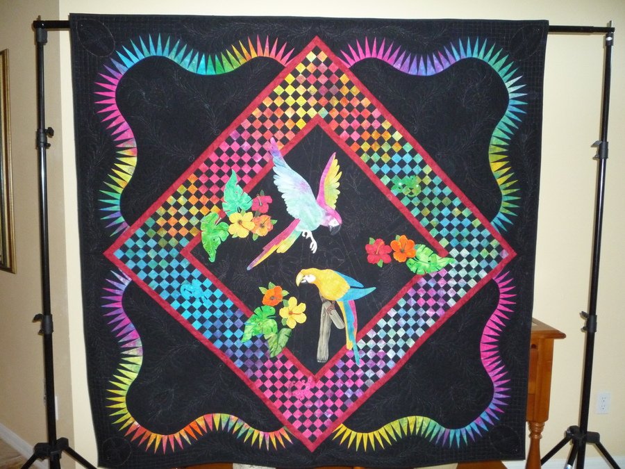 sciofalo Pirates of the Caribbean - Inspired by Jacqueline de Jonge quilts, Ricky Tims "Caveman's" fabric and birds from a children's church "Jungle" summer camp. The combination read like the Caribbean to me. Applique flowers and leaves with some hand embroidery. Thread painting on birds and flowers. Home sewing mahine quilting. See if you can find all the Geicos thougthout the quilt. There are 10.