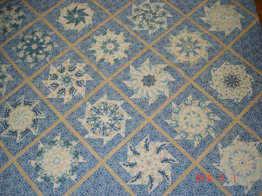 | Design Source - Description | Blue florals with tan sashing started as a workshop, continued at a retreat and finished with a heavily stitched "65" in the corner. Then I realized that my sister was 69. Hence the name "65 and holding. |