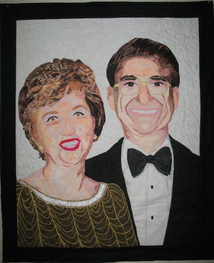 joanrae Dr. Milan and Mrs. Mary Brandon - This is a portrait quilt, made with guidance from Marilyn Belford, Realistic Fabric Portraits and Quilt University. The dress is stitched with Sulky rayon and then Superior Metalic threads.