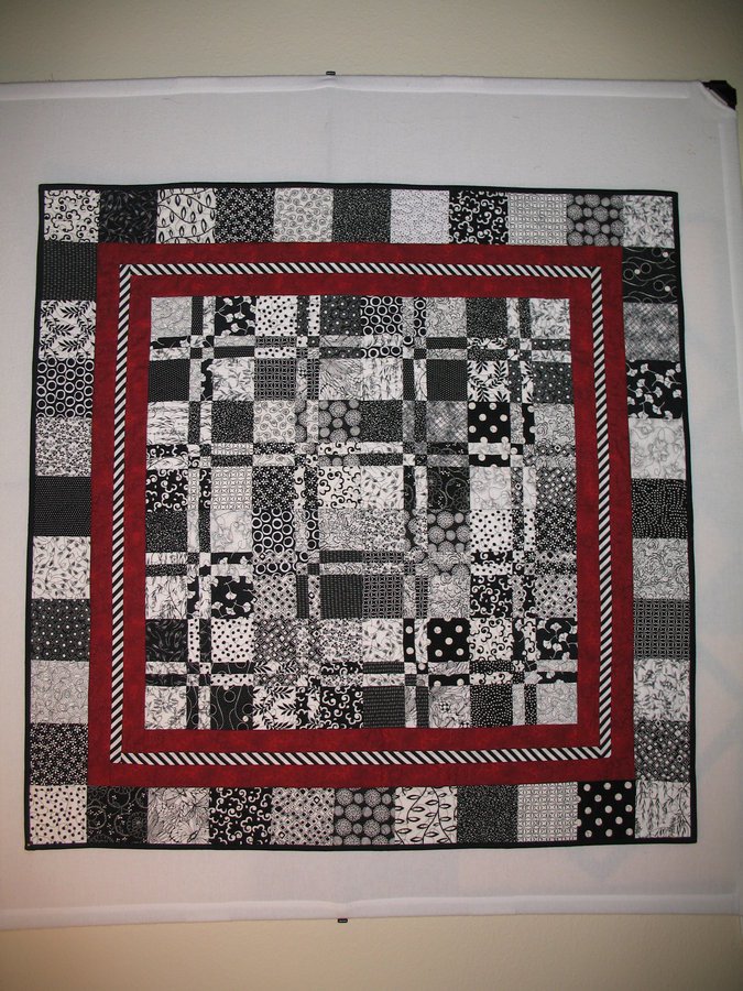 | Design Source - Description | My guild had a challenge using black & white fabrics plus one other color. This small quilt was made from pieces left over from another quilt. |