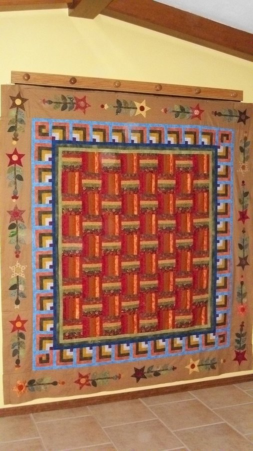 quiltsrfun Starring My Sister - My sister wanted a quilt for the tall two story wall next to the staircase that would pull together the colors in several rooms visible from that space. This quilt filled the bill and the country look of the appliqued border suited my sister's comfortable, homey personality. Thanks to Kim Diehl for the magazine pattern.