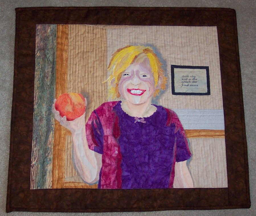 ashibut Love Those South Carolina Peaches! - I wanted to make a replica of my granddaughter's picture using fusing and fabric painting techniques I learned this summer from Lenore Crawford at the AQS Show in Knoxville, TN. I made one of her patterns first to learn how. This is the first time I have duplicated a person's picture in a quilt. I need to get more skin-tone fabrics!