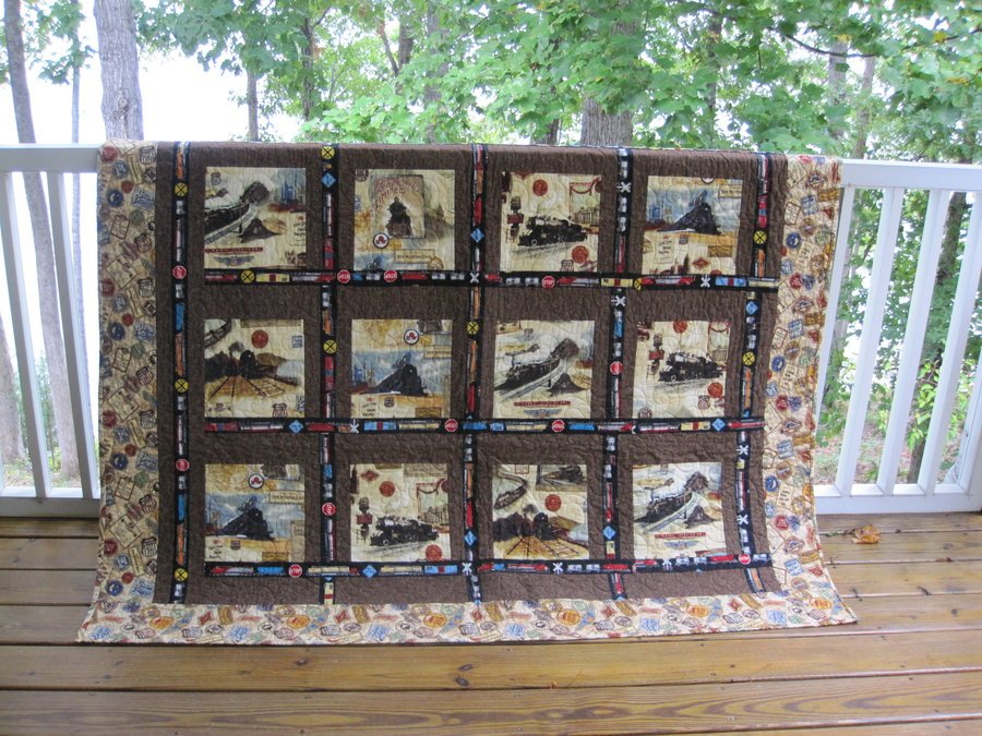 lizzyps Gerry's Train Quilt - This quilt was made by cutting out train pictures from fabric and sewing them into the quilt.