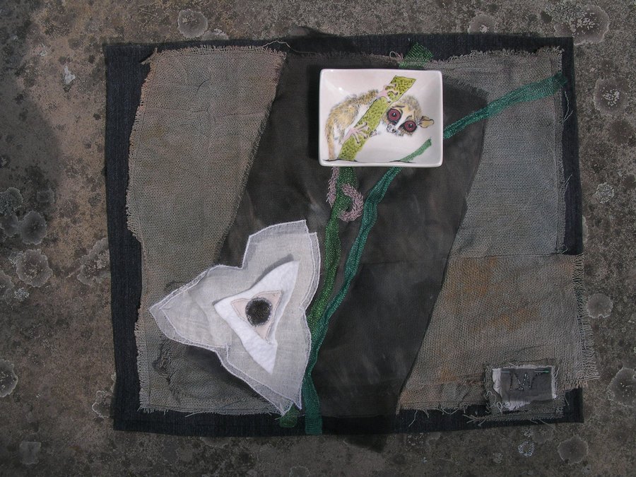Lalla Pygmy Mouse Lemur - thread painting, applique and hand painted small ceramic dish