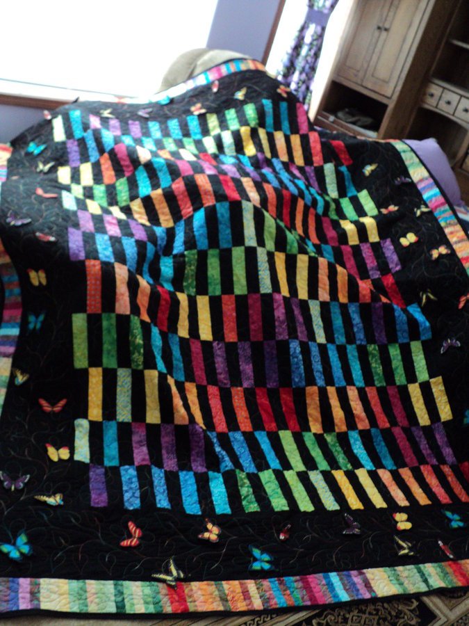 MTquilter09 Butterfly Dreams - I had so much fun piecing this quilt. I used jelly rolls and made 3-D butterflies that matched to the outer boarder. My first original design and my first use of 3-D. I have only been quilting for the last 2yrs. and thanks to my Mother who said"Just take one class, if you don't like it, I will quit bugging you to try and become a quilter" well she created a whole new me with that first class!