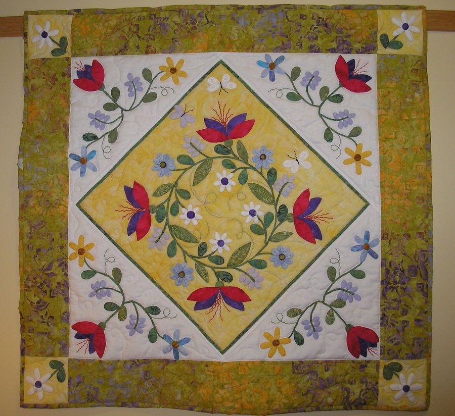 Reetzbobeetz Floral Bouquet - The Central floral wreath comes from Deborah Kemball's book Beautiful Botanicals. I adapted another idea from the book for the corner triangles. Apart from the white fabric all other fabrics are batiks. All of the applique is done by hand and it is machine quilted on a domestic Pfaff machine.