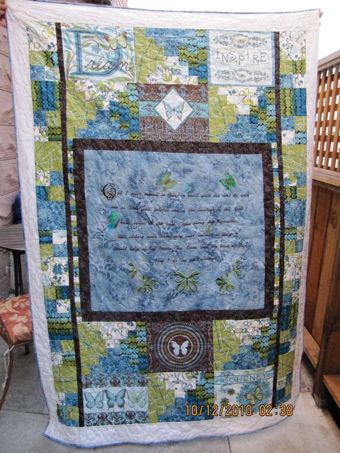 kathleenCaRN dare to dream - My best friend moved to Philly from CA. Her first winter was coming and I knew she was home sick. So I put the 3rd step prayer on it to remind her of who's in charge and Minky on the back to remind her she is loved. it has embroidered butterflies a symbol of growth.