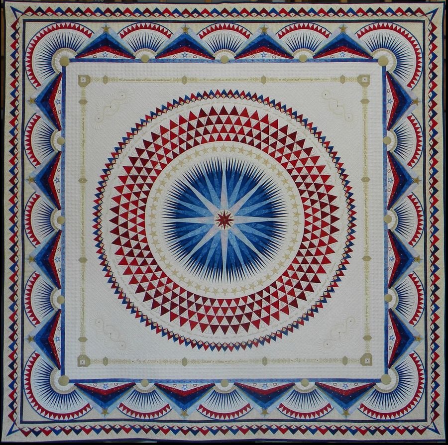 wyomingquilter America, Let It Shine - Tribute to America and its’ foundations and values, with the hope that they will guide us to a brighter future. Embellished with 5121 Swarovski Crystals: 4543 represent the words of the original U.S. Constitution 312 represent the words to the Star Spangled Banner 31 represent the words of the Pledge of Allegiance. 235 represent the years America has been a country I also incorporated American History by quilting parts of the Gettysburg Address, the Declaration of Independence and the Preamble to the Constitution. The 13 original colonies are represented by using 13 points on the outer blue rays and red triangles. The 50 states are represented with the ring of 50 stars. Quilted across the hanging sleeve are the words to the song “Proud to be an American” by Lee Greenwood. Designed and drafted on graph paper. Free motion quilted on 20 year old Bernina 1001. Quilt will be at PIQF