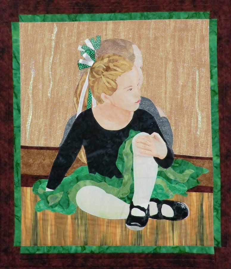 sherrie58 Dancer in Waiting - This quilt is based on a photo of my niece sitting in front of the dance studio mirror waiting for her turn to dance. Face painted, appliqued, mirror image is covered with glitter tulle and quilted with silver metalic thread. Quilt is owned by her family. Original design based on photo.