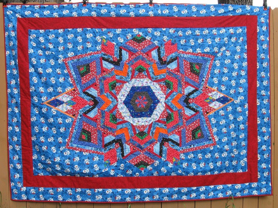 quiltrascal Kool Kaleidoscope - Added extra wedges to Ricky's pattern for length. Fleece backing, added a fabric inner layer for stability.