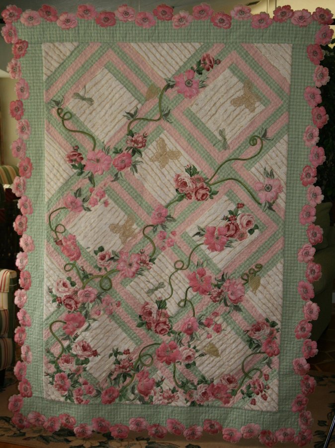 dycargill Through thr Garden Trellis - I took a seven month class from a local Jenny Haskins Educator and created this quilt. It contains "faux knitting" which creates fabric from assorted yarns, then cut into 12" squares. All the flowers are embrodered then appliqued on as well as decoupage flowers from coordinated fabric. The vines are silk roule and the butterflies and dragonflies are embroidered with metallic thread then appliqued. All fabrics and yarns are from Jenny Haskins.