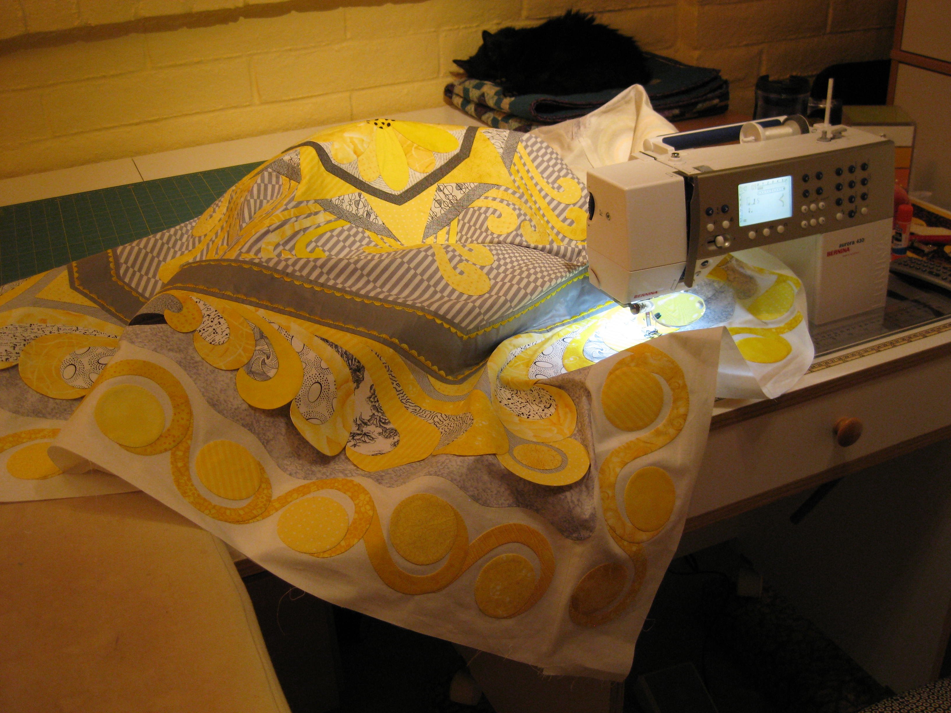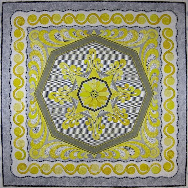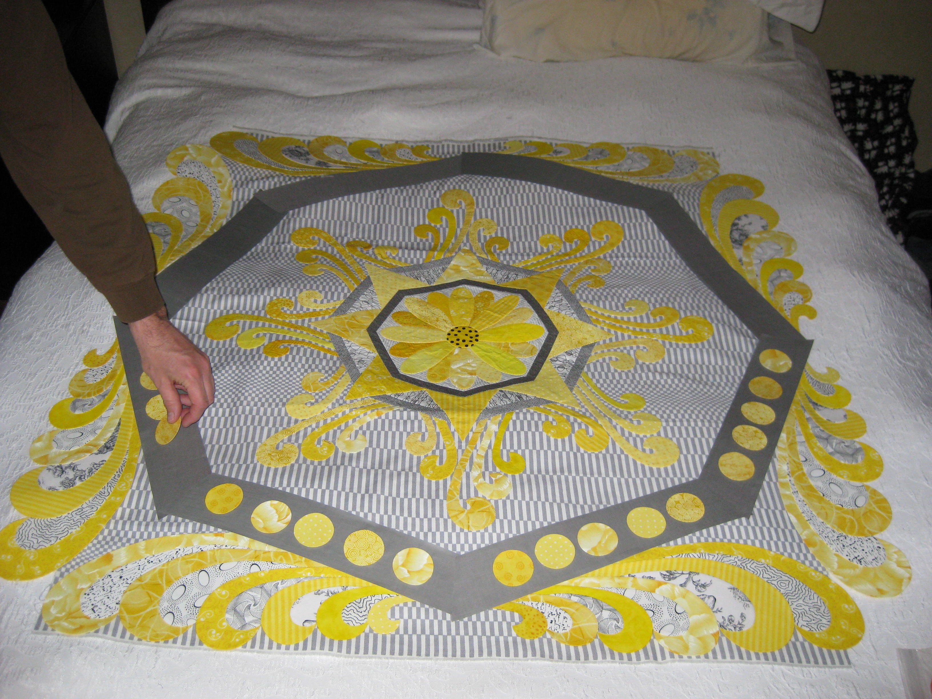 Curvilinear Energy - I've been working on a series of predominately one-color quilts and I've been using my quilting sketches for appliqué inspiration. This is my yellow quilt and an attempt at appliquéing feathers. The center flower and first octagon were inspired by one of my grandfather's wood carvings.
