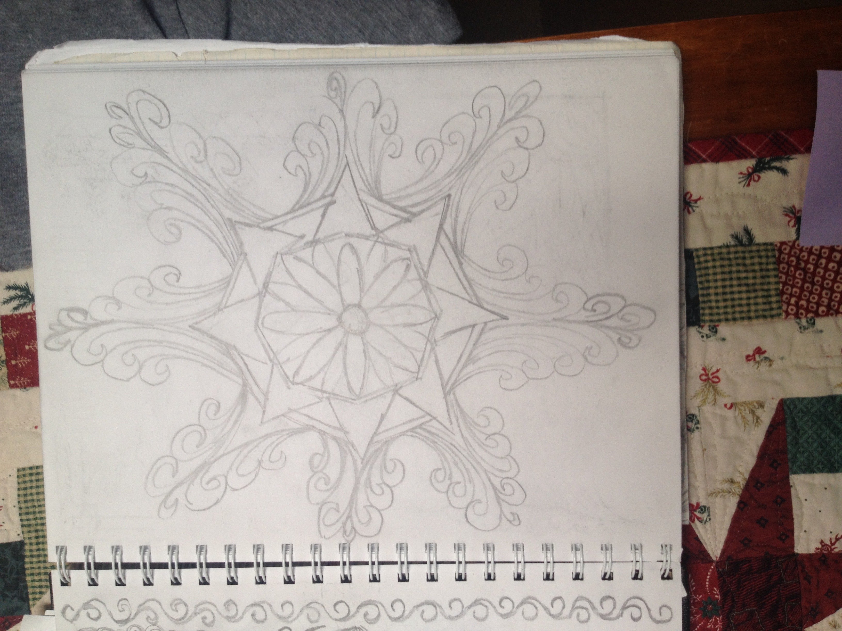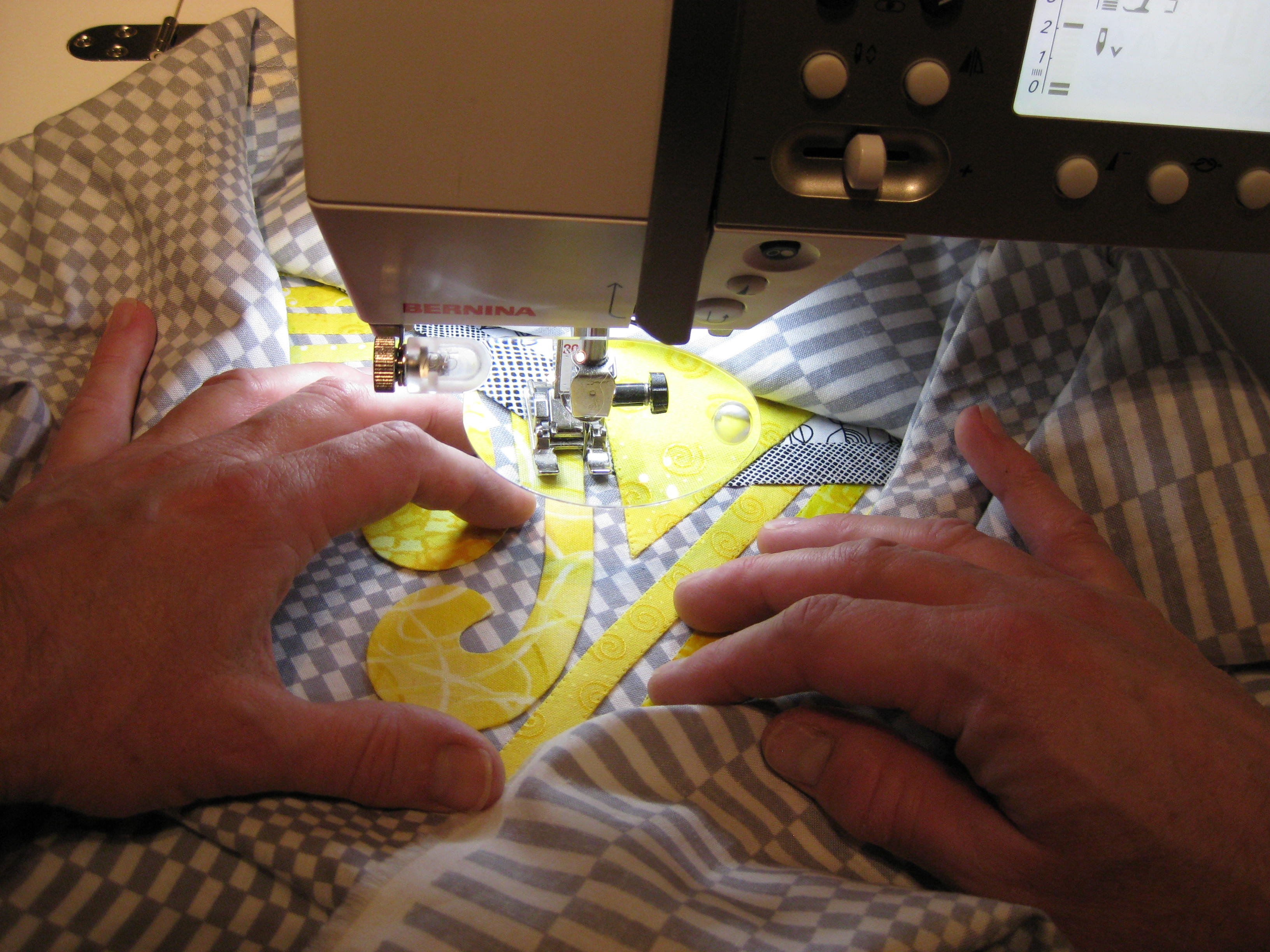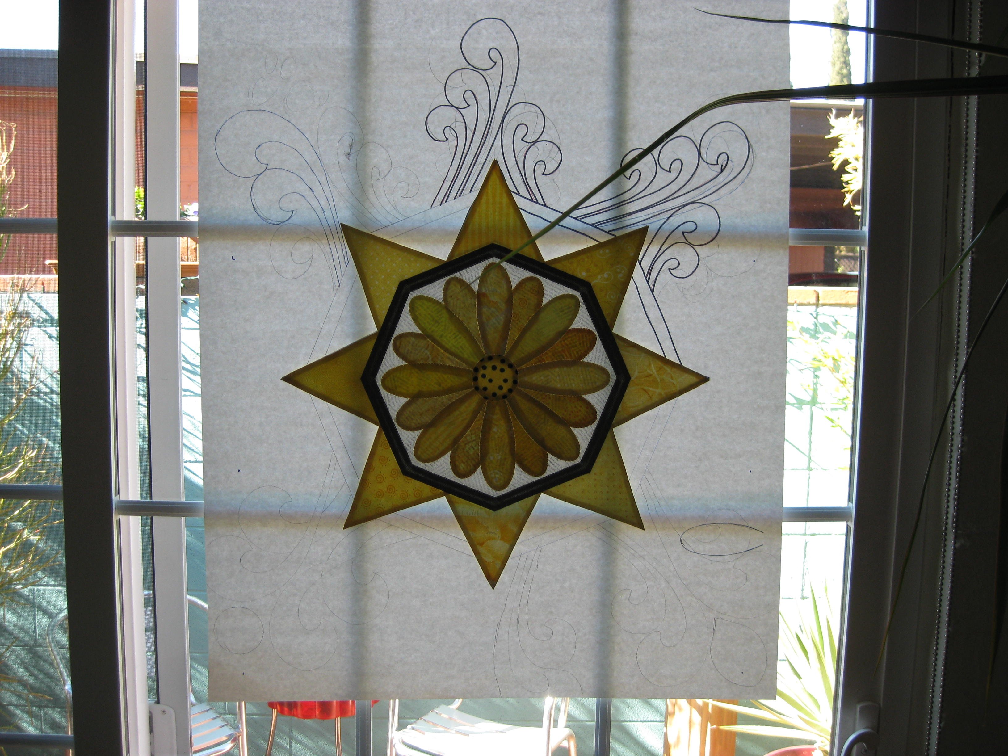 Curvilinear Energy - I've been working on a series of predominately one-color quilts and I've been using my quilting sketches for appliqué inspiration. This is my yellow quilt and an attempt at appliquéing feathers. The center flower and first octagon were inspired by one of my grandfather's wood carvings.