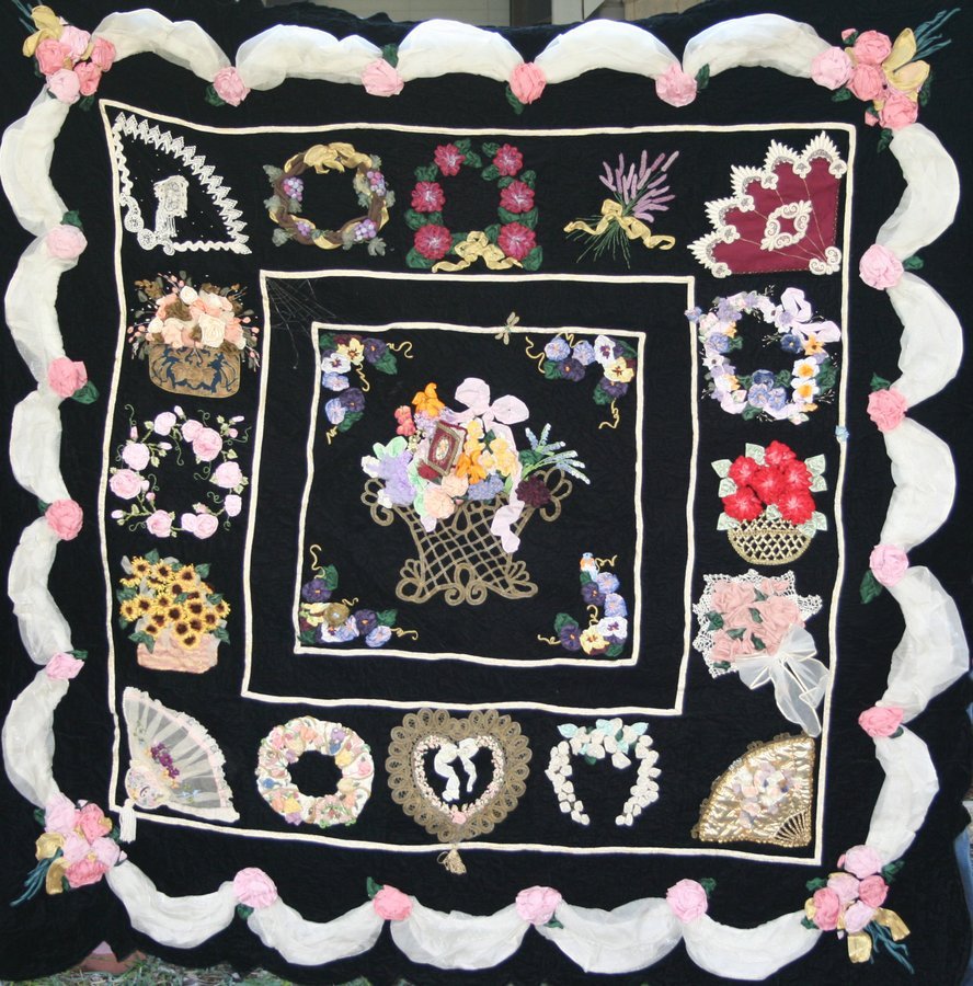 bobbiea0106 Baltimore In Ribbon - This quilt is created with black lush velvet, very heavy! It was my foray into creating three dimensional flowers and motifs from ribbon. Little did I know when I started this quilt, that Baltimore album style quilts would become my favorite genre.