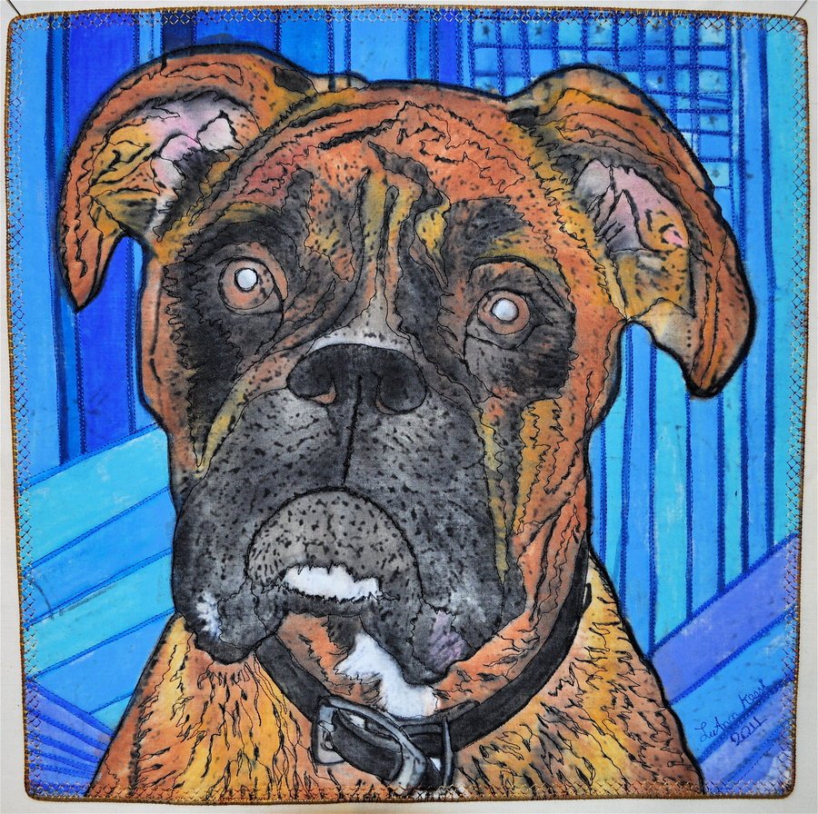 | Design Source - Description | Created from a photo image of our Dog, Gunnr. Neocolor II Watersoluble crayons were used to add the color. This was originally a plain, white piece of cotton fabric. |