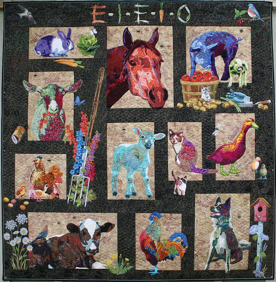 BonnieKeller Ms. MacDonald Had a Farm - Designed by Bonnie Keller and created by her quilt group. Each member took an animal and chose a color to create it in. Challenge was to use bright, wild fabric. Done with raw edge applique.