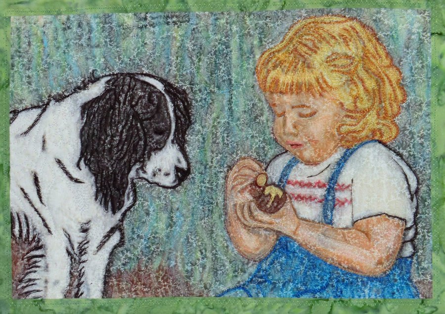| Design Source - Description | Created from the same photo as "Breakfast with a Friend". Photo altered in photoshop elements to sketch/ line drawing, then painted with watercolor crayons, thread sketching on hair and dog fur and quilted. |