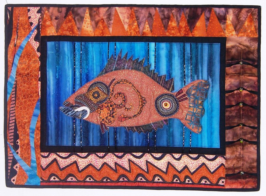 bondgirl Harvey - Harvey is a beautiful fish created with a collage technique. Bits of fabric cut, twisted & turned till he was just right then a layer of tulle was added and he was placed on the background. Thread sketching added more detail as well as the quilting. These are so fun to do.