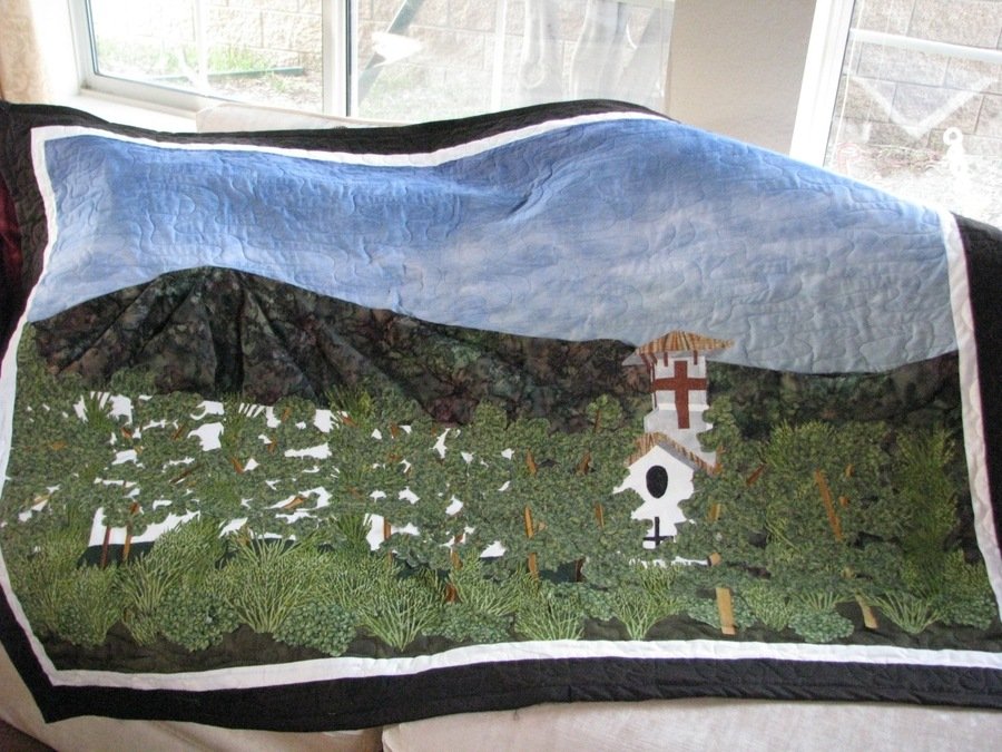 kaywave2 St. John's Landscape - This Quilt was auctioned for my daughter's school. It is the school nestled in the foothills of the Saddleback Mountains in Orange County, California. I took the photo, had a blank and white copy made, used the copy to make my templates and VOILA! Here it is!