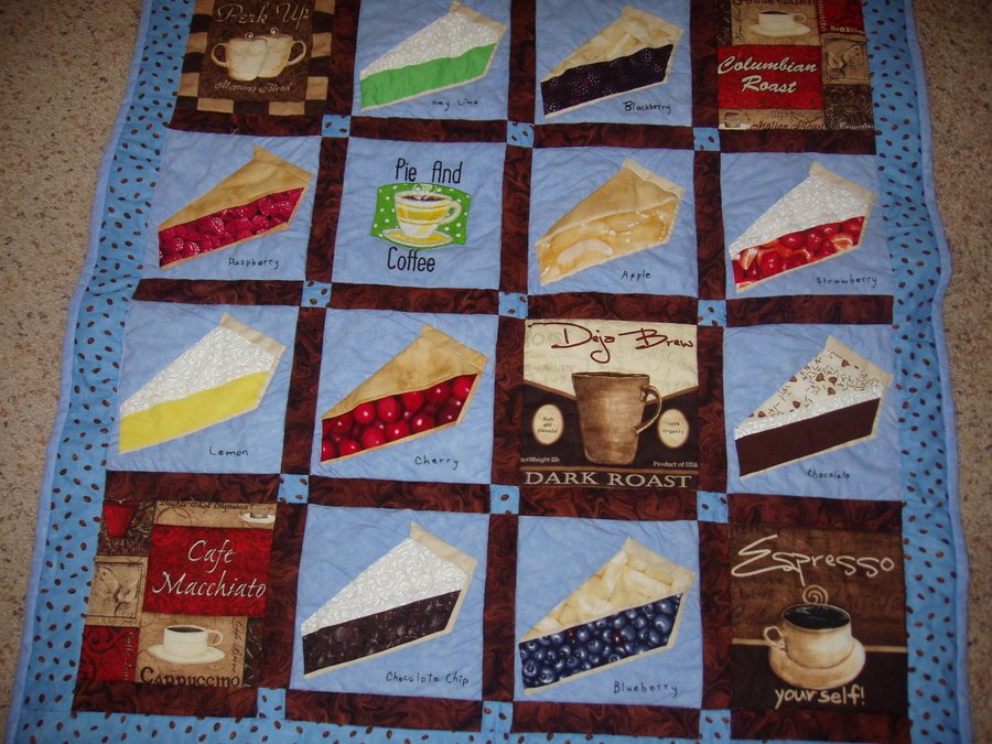 Joyce2010 Pie and Coffee - I enlarged from 9 blocks to 16. I bought the coffee printed material and thought it added to the quilt. I Machine Embroidered the center block Pie and Coffee. The outside border in coffee beans with blue background.