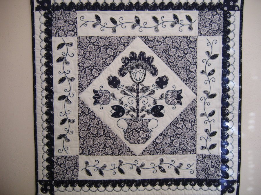 Susan101 Indigo's Allure - As soon as I saw this pattern I knew I had to make it. The hardest part was finding navy and white print fabrics. The blue was too light in most fabrics I found. The applique was fused with fusible web and then blanket stitched by hand.