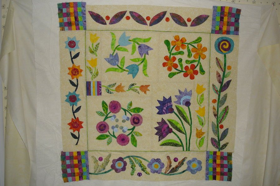 GmaLou Sampler - My first hand applique quilt is still in process with my experimental machine quilting. Since this is a first and a learning exercise, lots of tearing out wear and tear. Still, it will be a great wall hanging for my covered porch in the summer. The blocks were done in a class with Sara Hill at Marti's Patchwork Cottage in Black Mountain, NC.