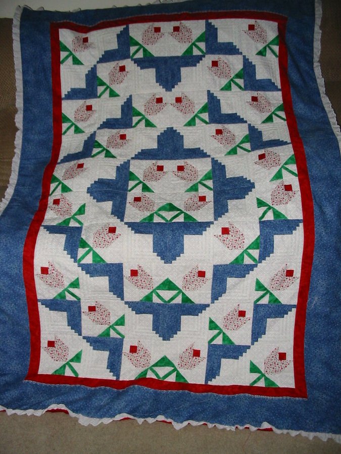 ddggs Betty's Garden - Last year my mother-in-law saw a small lap quilt I made years ago, and liked it better than any of my other quilts, so this year I made a larger version of it for her 84th birthday. It's a combination of tulip and log cabin blocks. Backing is "Minkie" to make it nice and snuggly. :) I also used an extra tulip block to make a throw pillow to match.