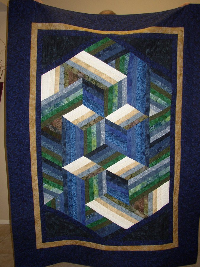 Simmons50s Physics 101 - The original design was 52"x57 3/4" and as our grandson is almost 6 feet tall, I needed to make the quilt larger. Therefore, added a second set of "cubes." Twenty-seven different fabrics were used; 17 different blues (Geoffrey's favorite color).