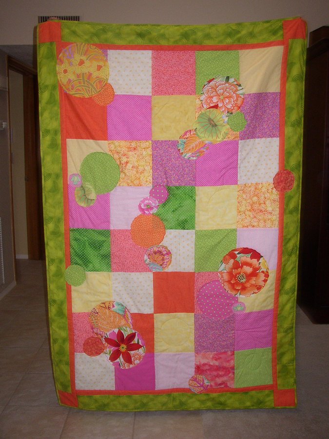 Simmons50s Happy Graduation - Sian wanted a quilt in hot pink, lime green, lemon yellow, orange and a touch of burgundy. Those are the colors I used in prints and batiks.