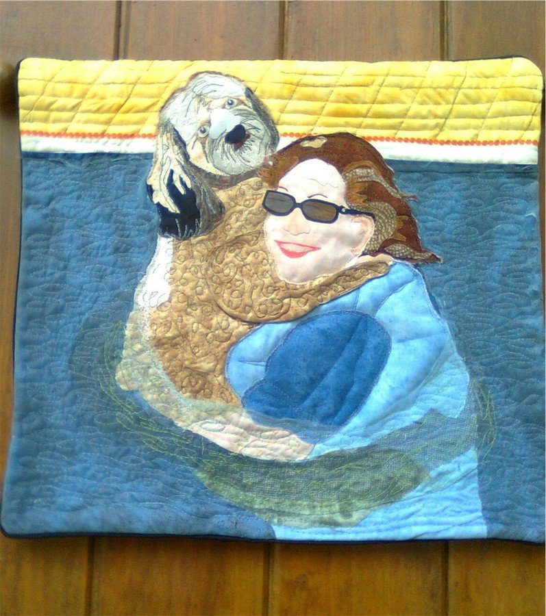 coffeequilts Anita and Buddy - I visited my sister and took a photo of her and her dog Buddy. This was Buddy's first dip in the pool. I used the photo to make a quilt. It came out so cute...a birthday gift for my sister and a memory of our visit together.
