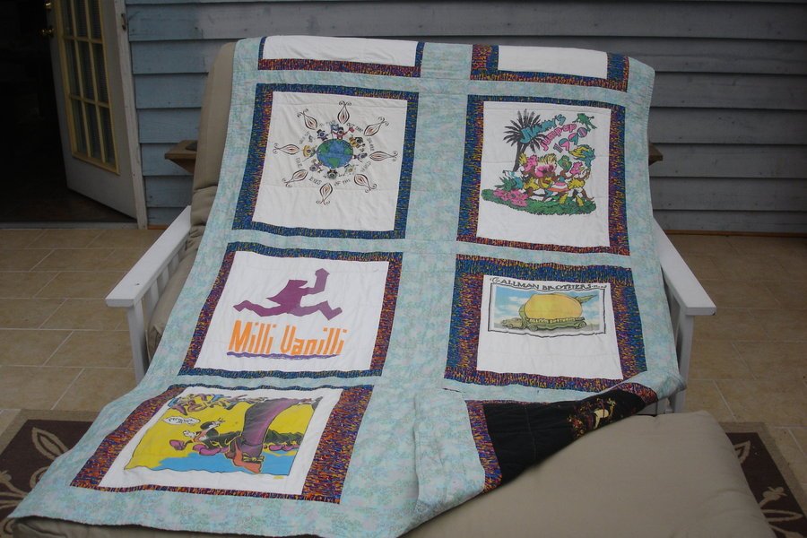 GmaLou Favorite T-Shirts - My sons worked their way through college driving t-shirt delivery trucks for musical groups in late 80s, early 90s. These are some of the T-shirts from that time. I am so proud of their hard work and thankful for their opportunity to so. Since it turned out to be so much larger than I intended, the quilt is reversible with t-shirts on both sides. Michelle Blevins taught this t-shirt quilts class at Asheville Cotton Company and was a patient teacher and a huge help.