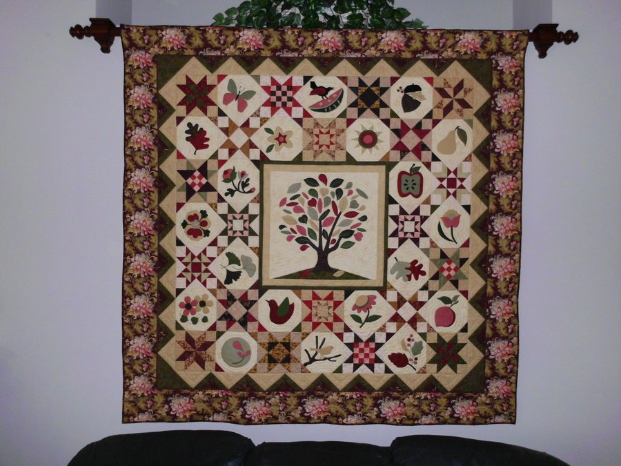 | Design Source - Description | This quilt is a Moda block of the month kit called Greenpiece. The applique blocks are made of washable wool, and were machine appliqued. |