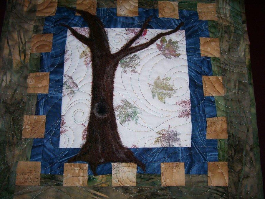 quisher1 Falling Leaves - This was a collaborative effort between myself and my friend Anne, a felter. I used my hand stamped leaf prints for the center and then added Terry Atkinson borders to finish the pieced top. Anne then felted a beautiful tree onto the piece. I added blowing wind quilting with variegated thread to finish. Very fun!