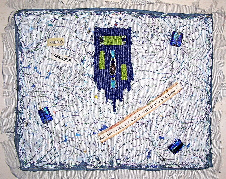 quisher1 Fabric Treasures - This piece was a blast to make. I started by pinning my backing onto my longarm leaders. My batting was shredded paper and credit cards. Then I placed netting over it all to finish my quilt sandwich. I McTavished to hold everything in place, finished it with a rough edge and embellished. The large focal point piece was a pin weaving project that didn't go quite as planned. I think it looks great on this piece. It's certainly a conversation starter!