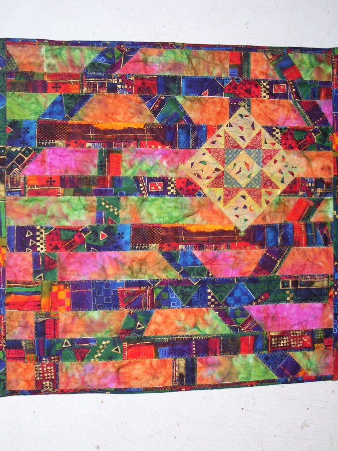 quisher1 Glue Anyone? - This was a challenge for a local show that required using the pastel batik fabric and a star. The deadline came a little faster than I had planned so I cut strips the finished size I wanted and arranged them on a quilt sandwich of backing and batting. Then I decoupaged the pieces to the batting by painting Elmer's Fabric glue over the top of the entire piece. When it dried, I quilted it on my longarm. It win a ribbon, but I like it. :D