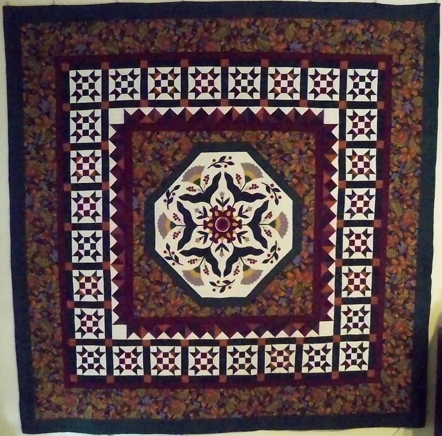 Nerak Eleven Eleven Eleven - Piecing finally completed on Veteran's Day 2011. Project had been a UFO for years until, with Alex's suggestions at the Houston Quilt Show, I turned to fused, machine applique to finish the partially completed stumbling block center panel. Once that hurdle was overcome, the rest of the piecing went quickly. Sweet-16 sit-down long-arm arrived and this was the first quilt done with it! I especially loved outline quilting leaves in the print sections.