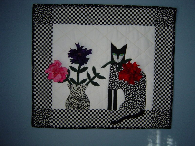 JaneHarris Naughty Puss - I made this little quilt for my guild show challenge. The challenge title was "Everything is Coming Up Roses". The challenge quilt had to include some type of rose or roses. I adapted the pattern by using Joan Shay's method of making 3-D roses. Two roses in the vase and one in the puss' mouth. It won a second place in the Rose Challenge.