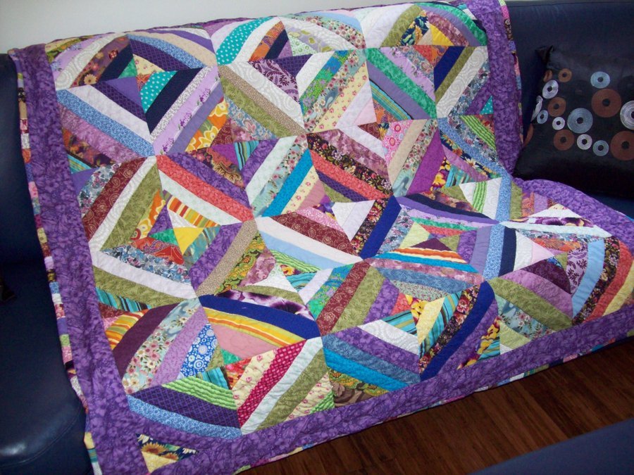 Copa55 Purple Strippy - I gave this quilt to my sister-in-law Pauline, for her 60th birthday. This was a free pattern from the internet at www.equilters.com by someone called Susan. I used recycled sheets of A4 paper as foundation paper. The quilt went together really fast, and turned out rather nice.