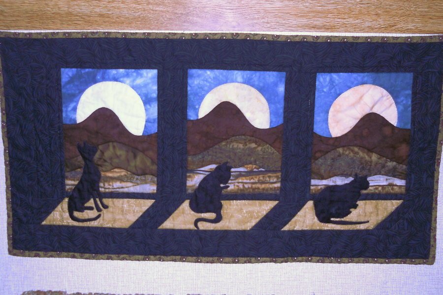 idaho Night After Night - Made as a class sample to demonstrate curved piecing methods by Sharon Schamber, Ruth McDowell and others. Only the kitties are raw edge appliqued in place.