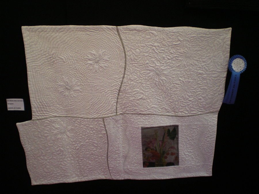 angelines Jarron con Flores - La tela de lienzo antiguo es de principios de 1900, está tejida a mano. La pieza de organza tiene una fotografía que he imprimido en ella con el ordenador, es transparente, detras no lleva ni boata ni trasera. The Antique Linen fabric is from early 1900, is made from non-industrial loom. The piece of organza has a picture that I printed on it with my computer, it is transparent and has no batting and backing behind.