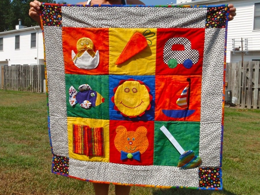 | Design Source - Description | The quilt is an activity quilt for babies for use in the early years when they are learning to use their hands. Most blocks include an 'action' item. The back is primarily black and white for the newborn. |