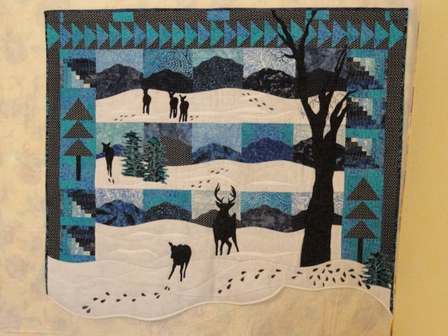 bonjohnsew Deer Tracks - This is my design depicting the many deer that we have living with us in the western North Carolina mountains. The deer are appliqued and the "snow" is white felt so it gives it a more dimensional feel. I had a lot of fun making this quilt! You can't tell that I like blue can you?