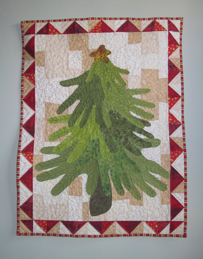 CLimber Family Tree - This wall hanging was made as a challenge with my co-workers. Requirements were a Christmas theme and use of the color green. I used tracings of my family member's hands and also a foot of my grandson for the tree trunk. The hands were placed on a pieced background and then machine free hand quilted down. I want a little fraying of the edges to look like pine needles.