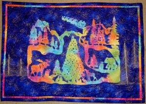 PattyS "Santa's First Stop" for Jacqueline in Alaska - This is a Continuum Quilting Pattern. Colorful Batik for main design. Fused to Cotton BG. Stitched on Avante18 inside area with blue thread. Meandered with gold thread, thread painted trees. Flange, Binding