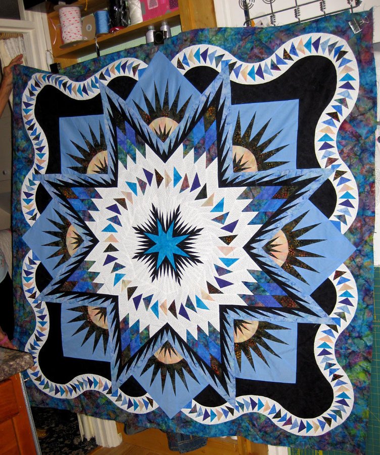 sewtrust Jans Star - This quilt is being made in memory of my dear Sister Jan who passed July 2011, it is in the process of being quilted, it is beautiful as she was, complicated striking and full of life and colour, the flying geese depict to me that she has never gone away, just out of sight. It was very hard to start this with the heaviest of heart, but I knew it would help me to get over the extreme grief of losing someone so dear to me. As soon as it completed I will add the quilted and finshed version.