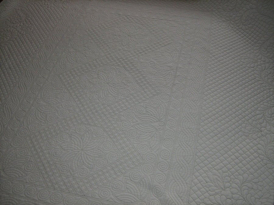 Brenda Margaret's Quilt - A whole cloth king sized bed quilt, commissioned by Flo Simmonds to give to her Grandson as a wedding present. Margaret Hatty designed the pattern using Sandy Lush and Barbara Chainey's deisgns as inspiration. Margaret had just started the quilting when she was taken ill and died, before finishing it. I took the quilt and finished it for Flo, so that when her grandson and his bride came home from their tour of duty in Afghanistan in January, she could give it to them. I have had the quilt since the begining of July and have quilted on it for about 3 hours a day, till it was finished at the begining of December. I have now passed the quilt over to Flo Simmonds. This is the best photo I have of the quilt.........:(