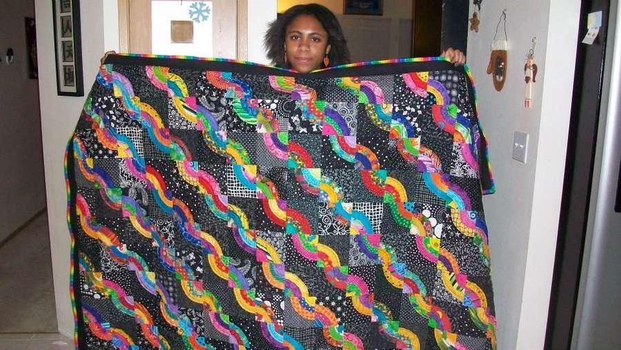 sassystash Ruffled Waves - Ruffled Waves started as a group project at Quilt Country in Lewisville, TX. Ladies at sit an sew all made 4 blocks, cut each block into square quarters and then exchanged them. I took mine and added more to sew them into a Drunkard's Path setting. I knew that I was making the quilt for my 14 year old great-granddaughter, Chantel, because she loves colors so much. This quilt was so much fun to play with the blocks and finally complete the quilt for our lovely Chantel.