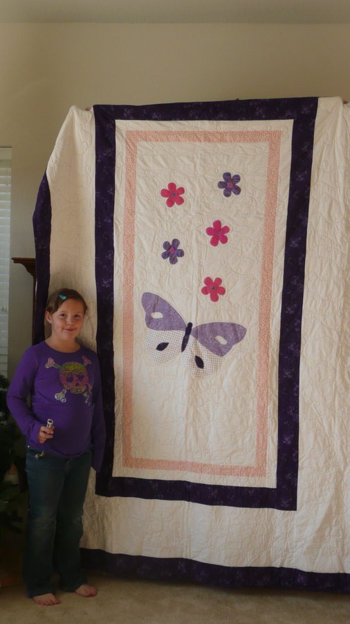 gwonson butterfllies and flowers - Erika loves Butterflies and flowers. She is changing the colors in her room from completely pink to purple with a touch of pink. I saw several quilts at Pottery Barn for Kids and adapted this one to be close to them. She says it is perfect. It was lots of fun to make. I had to freehand draw the butterfly to applique on and used my flower die from accuquilt. I also used the strip cutters to make things easier. Quite an easy quilt to get done right before Christmas with all the rush.