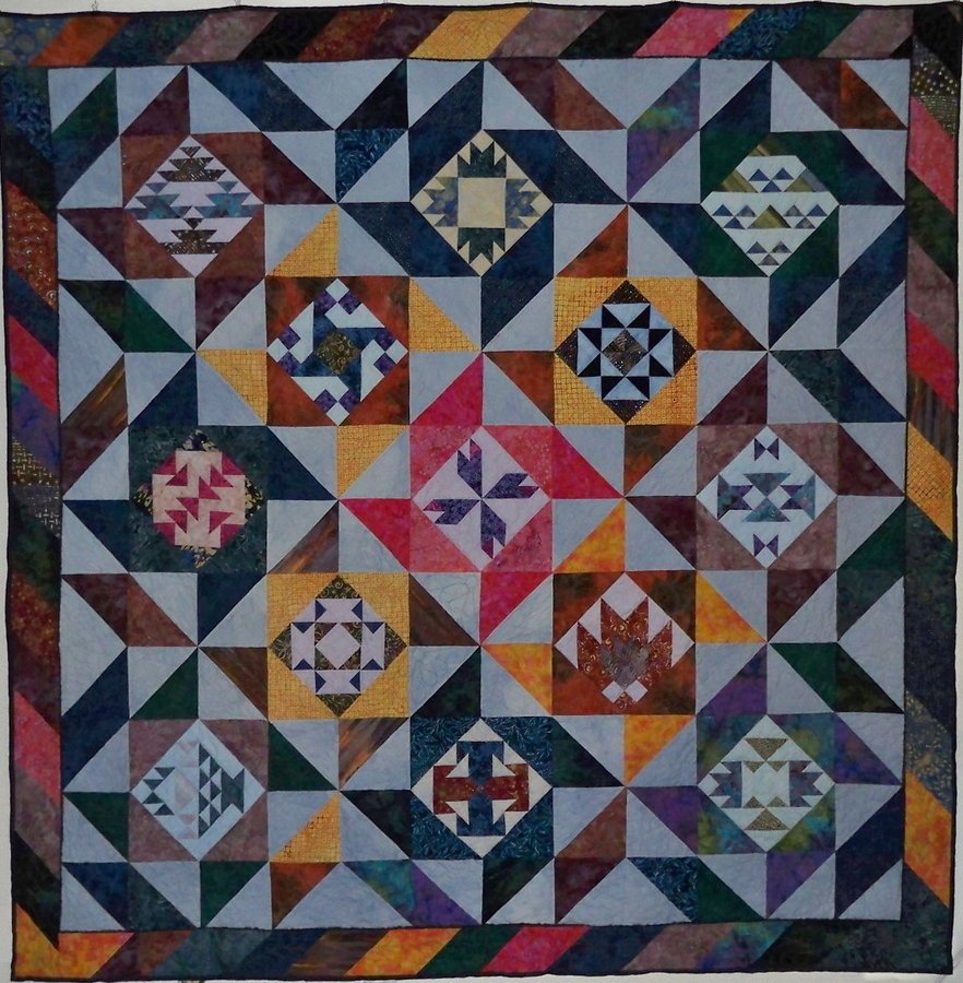 | Design Source - Description | Half Square triangle setting blocks transform the background into pinwheels. This is the first quilt entirely quilted on my new Sweet-16 machine. I even designed the feathers worked into the backgrounds. |