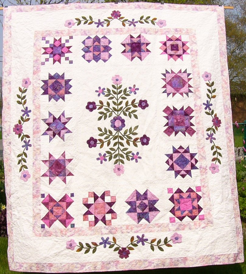 mitemo Stars Around the Garden - The quilt combines both patchwork and applique. The original design had applique in the corners of the final border. I changed this to applique centered in each border.